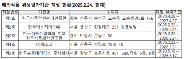 이번에 해외식품 위생평가기관으로 재지정 받은 곳은 △한국에스지에스㈜ △한국식품산업협회 부설 한국식품과학연구원 △㈜세스코로, 이들 기관의 지정 유효기간은 2025년 2월 22일부터 2028년 2월 21일까지다.