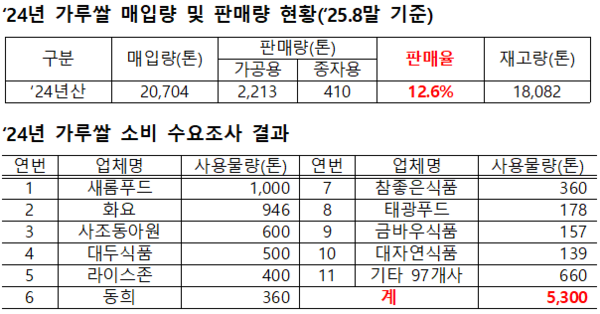 "2024년산 가루쌀 매입량 2만704톤, 올 8월 말 기준 판매량은 2626톤...재고는 1만8000톤"