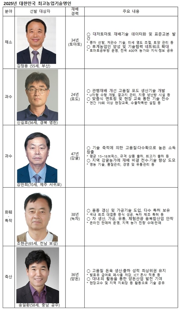 농촌진흥청(청장 이승돈)은 채소, 과수, 화훼ㆍ특작, 축산 4개 부문 5개 품목에서 2025년 ‘대한민국 최고농업기술명인’ 5인을 선정했다. 올해는 식량 부문 응모자가 없어 과수 부문에 1명을 추가했다.