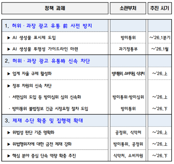 AI 등을 활용한 시장질서 교란 허위ㆍ과장광고 대응방안 정책 과제별 소관부처 및 추진 시기
