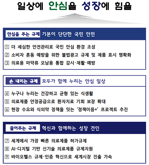 식약처는 “새해는 국정과제 이행 원년으로, 국민이 체감할 수 있는 정책 성과를 도출하기 위해 ‘기본이 단단한 국민 안전’, ‘모두가 함께 누리는 안심 일상’, ‘혁신과 함께하는 성장 견인’이라는 세 가지 전략을 추진하겠다”고 보고했다.
