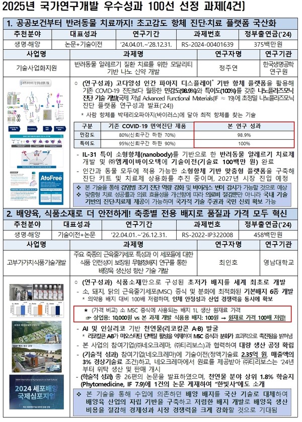 농림식품 분야 연구개발 성과 4건이 2025년 국가연구개발 우수성과 100선에 선정됐다.