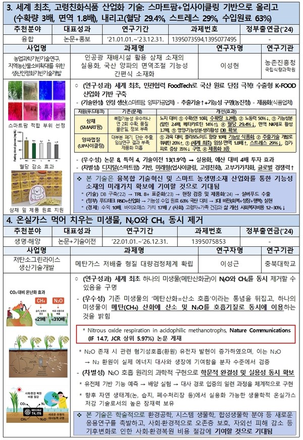 이번 100선에 선정된 농림식품 분야 성과는 △온실가스(N2O, CH4) 먹어치우는 미생물 발견 △초고감도 항체 진단·치료 플랫폼 국산화 △식품소재만으로 구성된 배양육 배지 세계 최초 개발 △스마트팜과 업사이클링 기술을 결합한 세계 최초 고령친화식품 산업화 기술 개발이다.