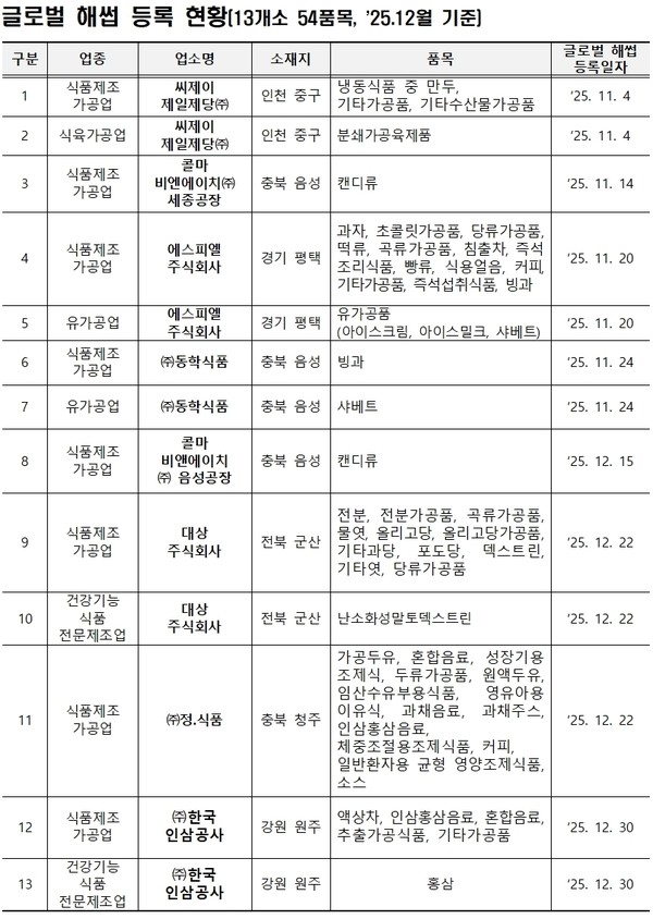 식약처는 지난해 8월 국내ㆍ외 식품 제조 환경, 기준 변화 등에 발맞춰 국제 기준에 부합하는 글로벌 해썹을 도입했으며, 지난해 말 기준 CJ제일제당 등 13개 업체 54품목이 글로벌 해썹 등록을 완료했다.