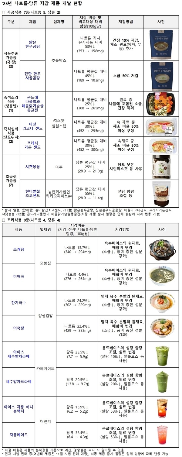 올해 식품의약품안전처(처장 오유경)의 나트륨ㆍ당류 저감 제품 개발 기술지원 사업을 통해 나트륨을 줄인 한우곰탕 등 가공식품 7종과 당류를 줄인 자몽에이드 등 조리식품 8종이 개발됐다.