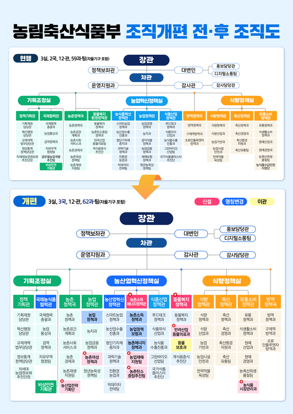 농식품부는 이번 조직 개편을 통해 1관 신설, 1국(관) 대체 신설, 21명 증원으로 기존 3실, 2국ㆍ12관, 59과ㆍ팀에서 3실, 3국ㆍ12관, 62과ㆍ팀 체계로 확대되며, 2017년 방역정책국 신설(순증), 2022년 동물복지환경정책관 신설(대체신설) 이후 3년여 만에 대규모 조직 개편을 단행하게 됐다.