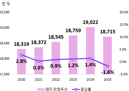 2025년 한 해 소·돼지·닭·말의 등급판정 두수는 전년보다 줄어든 반면, 오리, 계란의 등급판정 두수는 증가한 것으로 나타났다.