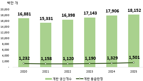 계란 등급판정 개수는 15억146만1180개로 전년보다 12.9% 증가했으며, 전체 계란 생산 개수의 8.3%가 등급판정을 받았다. 등급별 출현율은 1+등급(90.0%), 1등급(10.0%), 2등급(0.0%) 순을 보였다.