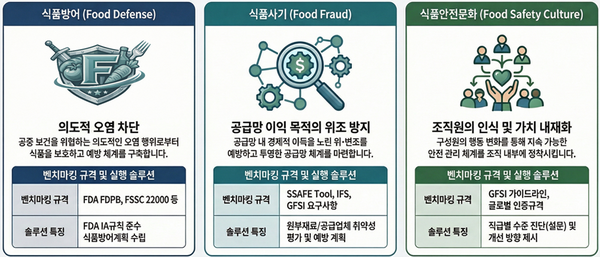 최근 국제 식품안전 규제는 제조 공정상 위생관리를 넘어 의도적인 오염 방지(식품방어), 경제적 부정행위(식품사기), 조직문화(식품안전문화)까지 확대되는 추세로, 특히 국제식품안전협회(GFSI)가 인정하는 국제 인증 규격은 예방 중심 관리와 함께 이 3대 영역을 핵심 요구사항으로 규정하고 있다.
