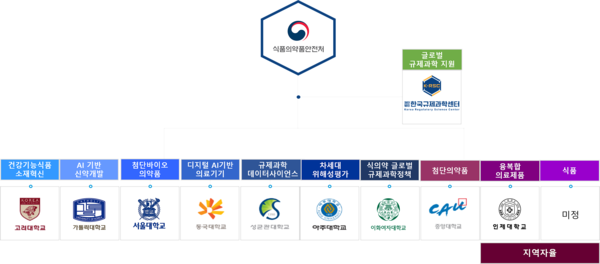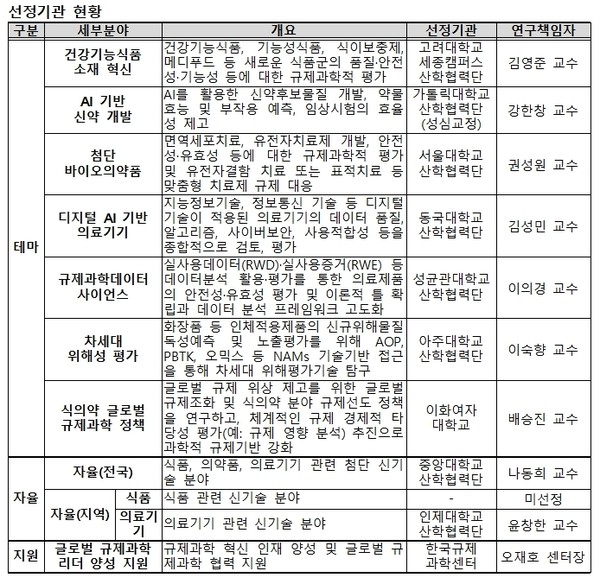 테마별로 △건강기능식품 소재 혁신: 고려대학교 세종캠퍼스 산학협력단 △AI 기반 신약 개발: 가톨릭대학교 산학협력단 성심교정 △첨단 바이오의약품: 서울대학교 산학협력단 △디지털 AI기반 의료기기: 동국대학교 산학협력단 △규제과학데이터 사이언스: 성균관대학교 산학협력단 △차세대 위해성 평가: 아주대학교 산학협력단) △식의약 글로벌 규제과학 정책: 이화여자대학교)이 선정됐다.